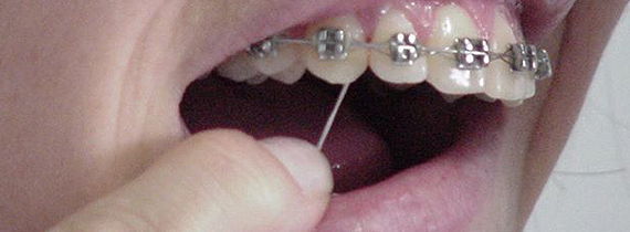 O uso do fio dental é tão importante quanto a escovação, pois ajuda a remover a placa bacteriana e os resíduos de alimentos que ficam entre os dentes. Use fio dental encerado, pois tem probabilidade menor de ficar enganchado ou desfiar-se nos braquetes.